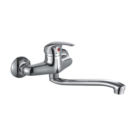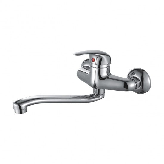 - Este o baterie conceputa pentru montarea pe perete, are un design clasic și finisaj cromat, cu țeavă de scurgere mobilă, lungime 240 mm.