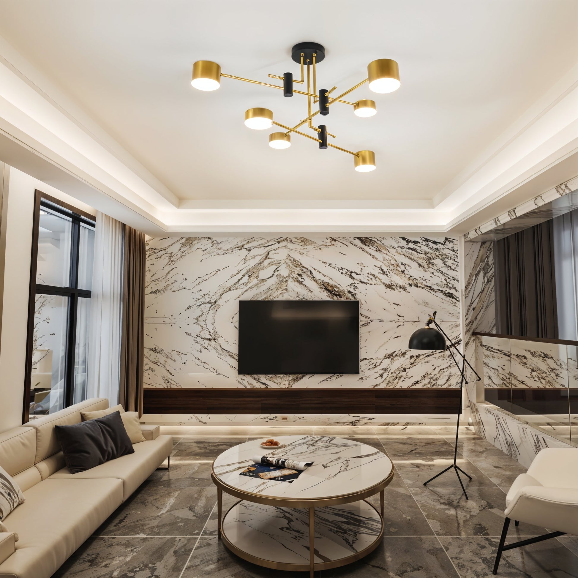 Brațele rigide cu detalii aurii oferă un contrast vizual elegant, potrivit pentru livinguri, birouri sau spații comerciale.