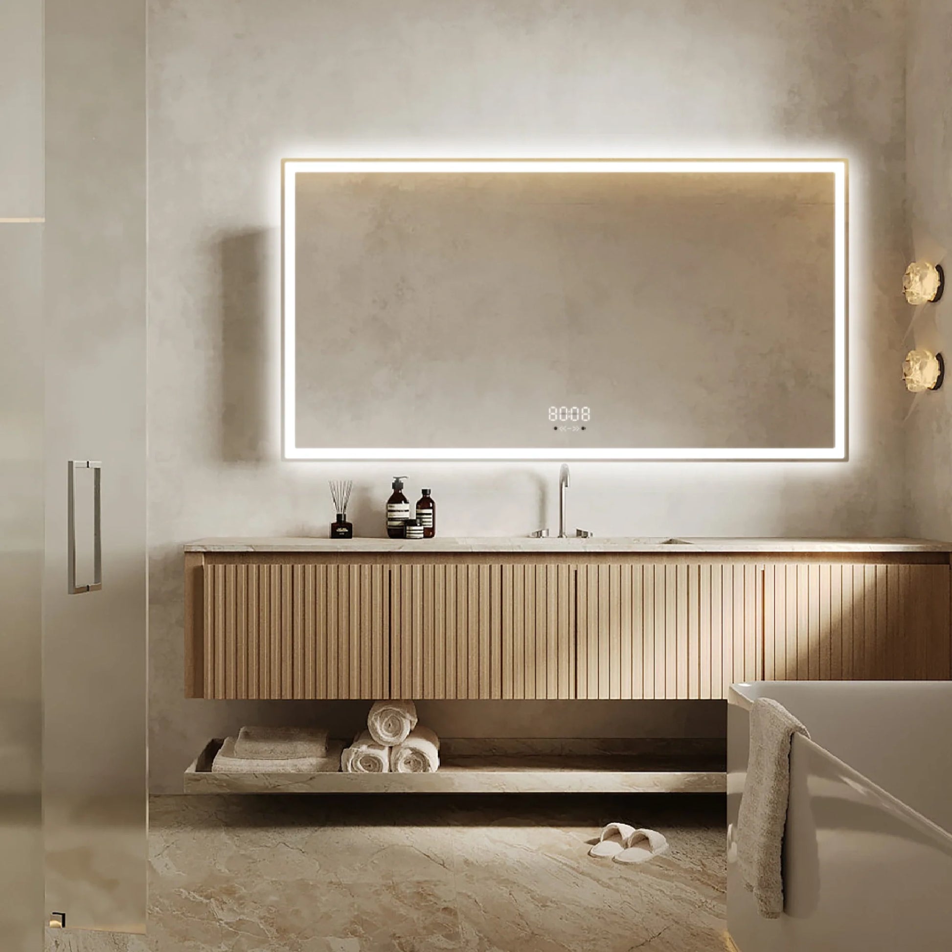 🪞 Elegantă, practică și complet digitalizată – oglinda LED 150×80 cm este alegerea ideală pentru băile moderne, oferind funcționalități inteligente și un design curat.
