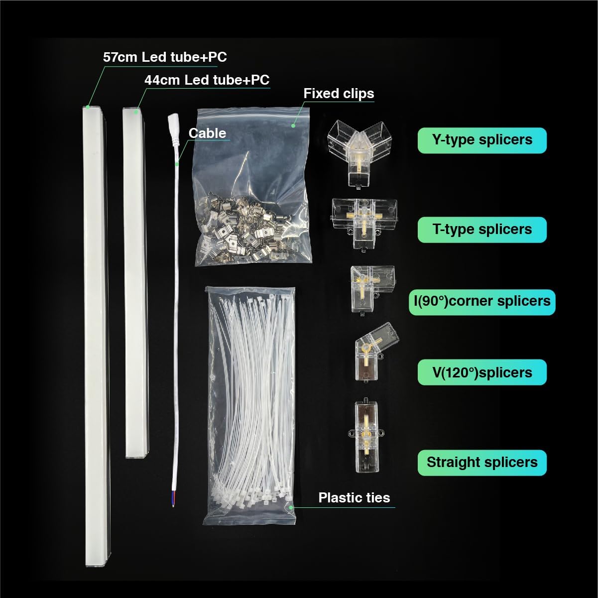 Pachetul contine: 57 tuburi LED 44 x 2.5 x 3cm, 12 tuburi LED 117.5 x 2.5 x 3cm + conectorii necesari pentru ansamblul de 14 hexagoane si cablul de alimentare.