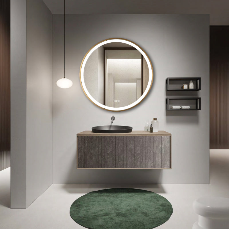 Transformă baia într-un spa modern și funcțional cu oglinda LED rotunda premium de 70×70 cm, cu rama aurie, creată pentru confort, estetică și tehnologie inteligentă. Oglinda este fabricată din sticlă argintie de 5 mm, fără cupru (tehnologie anti-oxidare), cu iluminare dublă (față + margine/spate) și senzori de miscare integrați pentru control total al funcțiilor fara a atinge oglinda.